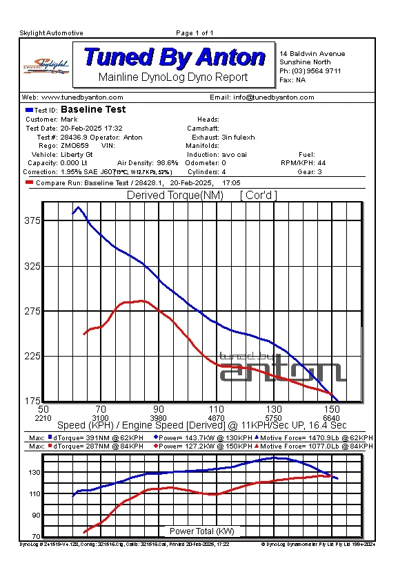 Subaru Liberty GT fitted with a full 3in exhaust and cold air intake impressive gain of +104Nm! Torque is up, response is sharper.