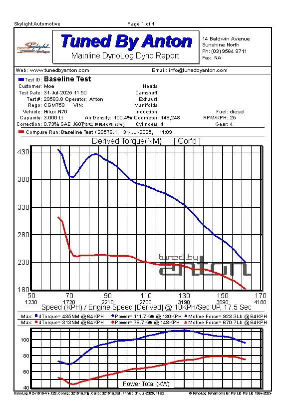 The N70 Hilux now fitted with a snorkel and custom tune is producing +32kW and +122Nm. Pulling hard run after run. Optimised for towing and off road use, it is now effortless to drive, responsive, and far more enjoyable overall.
